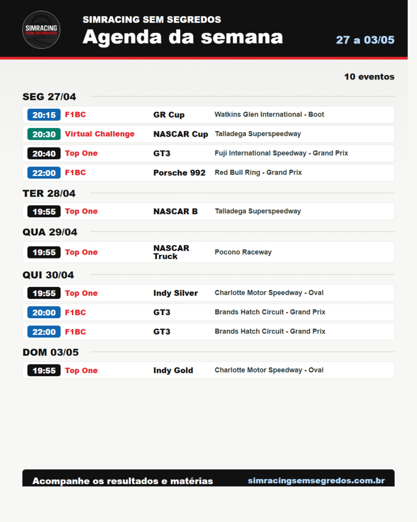 Acompanhe corridas de liga, quem venceu a semana, mudanças no grid e matérias para ficar por dentro do que está acontecendo fora da Academia.